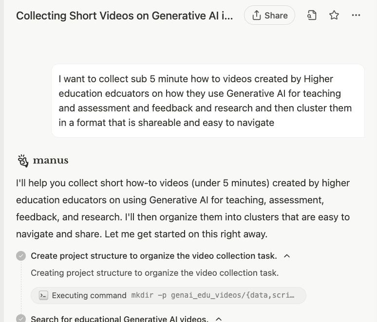 I wanted to see what I could get from a single prompt so decided to see if it could build a shareable, searchable web page that curates short how-to videos (under five minutes) by higher education educators demonstrating uses of Generative AI. I began by requesting Manus to collect and cluster videos showing how AI is applied in teaching, assessment, feedback, and research (Natural Language Prompt). Manus responded immediately by creating a structured project directory and initiating web searches to identify relevant video content, starting with collections from institutions like Notre Dame and Harvard (which it didn’t get beyond in the first iteration).